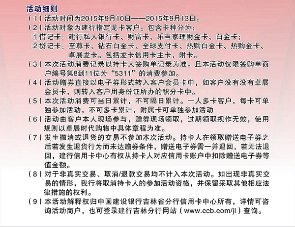 (9)本活动解释权归中国建设银行吉林省分行信用卡中心所有,详情可咨询活动商户,也可登录建行吉林分行网站(www.ccb.com/jl)查询。