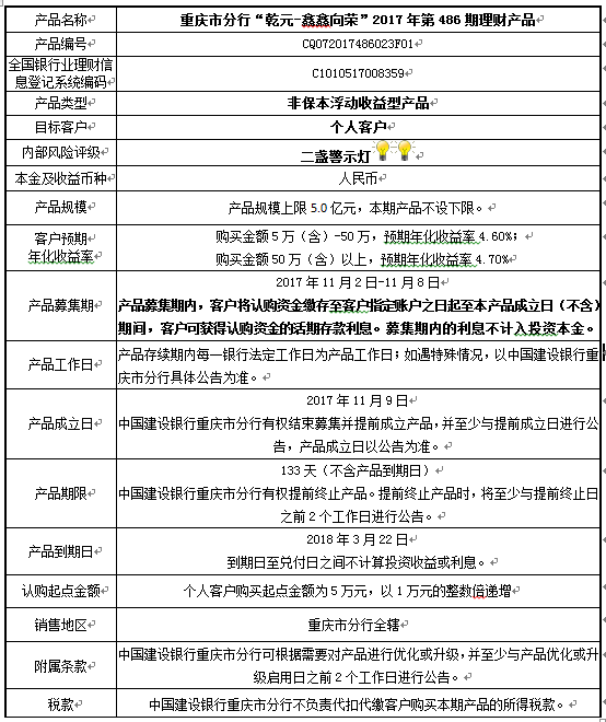 1.本期产品规模上限:5.0亿元。在本期产品募集期内,对本期产品的认购金额达到本期理财产品规模上限,则中国建设银行重庆市分行有权利但无义务停止本期产品的认购,已经认购成功的客户投资权益不受影响。