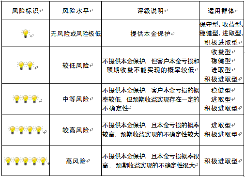 本产品为非保本浮动收益型理财产品,不保证本金和收益,请您充分认识投资风险,谨慎投资。本期产品期限为358天(中国建设银行有权对产品进行展期或提前终止),存续期内,产品不接受申购或赎回申请。本期产品内部风险评级级别为三盏警示灯 ,风险水平属于中等风险。最不利情况下,您将损失全部收益甚至包括全部本金。本理财产品适用于稳健型、进取型 、积极进取型客户。