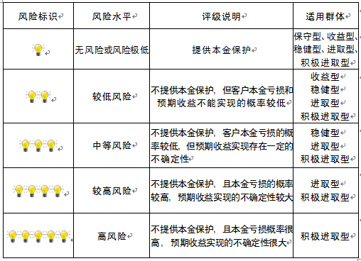 本产品为非保本浮动收益型理财产品,不保证本金和收益,请您充分认识投资风险,谨慎投资。本期产品期限为105天(中国建设银行有权对产品进行展期或提前终止),存续期内,产品不接受申购或赎回申请。本期产品内部风险评级级别为二盏警示灯 ,风险水平属于较低风险。最不利情况下,您将损失全部收益甚至包括全部本金。本理财产品适用于收益型、稳健型、进取型 、积极进取型客户。
