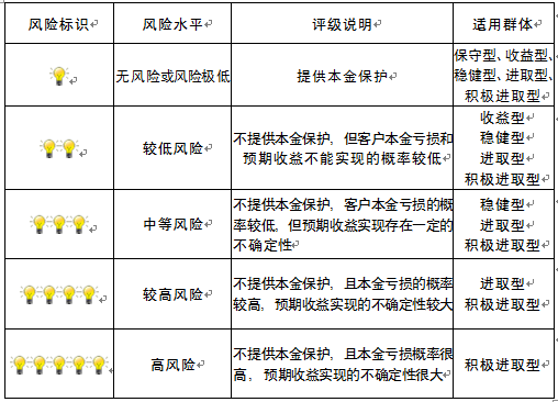 本产品为非保本浮动收益型理财产品,不保证本金和收益,请您充分认识投资风险,谨慎投资。本期产品期限为125天(中国建设银行有权对产品进行展期或提前终止),存续期内,产品不接受申购或赎回申请。本期产品内部风险评级级别为二盏警示灯 ,风险水平属于较低风险。最不利情况下,您将损失全部收益甚至包括全部本金。本理财产品适用于收益型、稳健型、进取型 、积极进取型客户。