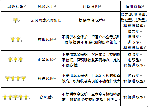 本产品为非保本浮动收益型理财产品,不保证本金和收益,请您充分认识投资风险,谨慎投资。本期产品期限为266天(中国建设银行有权对产品进行展期或提前终止),存续期内,产品不接受申购或赎回申请。本期产品内部风险评级级别为二盏警示灯 ,风险水平属于较低风险。最不利情况下,您将损失全部收益甚至包括全部本金。本理财产品适用于收益型、稳健型、进取型 、积极进取型客户。