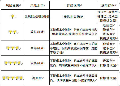 本产品为非保本浮动收益型理财产品,不保证本金和收益,请您充分认识投资风险,谨慎投资。本期产品期限为177天(中国建设银行有权对产品进行展期或提前终止),存续期内,产品不接受申购或赎回申请。本期产品内部风险评级级别为二盏警示灯 ,风险水平属于较低风险。最不利情况下,您将损失全部收益甚至包括全部本金。本理财产品适用于收益型、稳健型、进取型 、积极进取型客户。