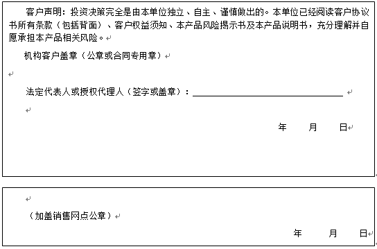 客户签名: ( 客户声明:投资决策完全是由客户独立、自主、谨慎做出的。客户已经阅读客户协议书所有条款(包括背面)、客户权益须知、本产品风险揭示书及本产品说明书,充分理解并自愿承担本产品相关风险。)