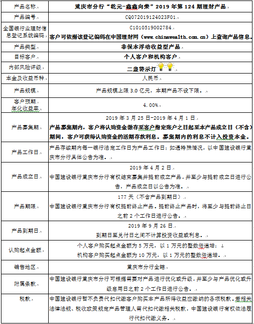 3.中国建设银行重庆市分行可根据市场情况等调整产品规模上、下限,并最迟于调整规模上下限当日进行公告。