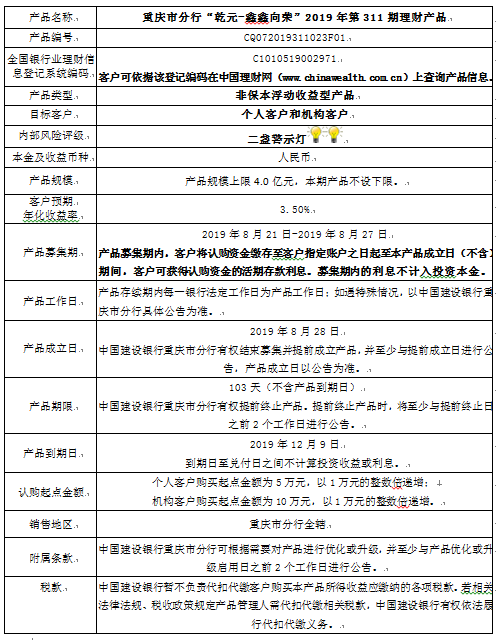 3.中国建设银行重庆市分行可根据市场情况等调整产品规模上、下限,并最迟于调整规模上下限当日进行公告。