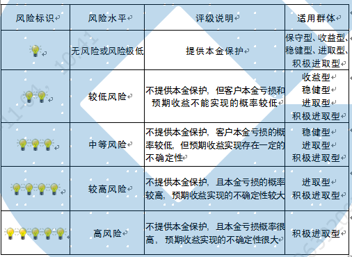 本产品为非保本浮动收益型理财产品,不保证本金和收益,请您充分认识投资风险,谨慎投资。本期产品期限为125天(中国建设银行有权对产品进行展期或提前终止),存续期内,产品不接受申购或赎回申请。本期产品内部风险评级级别为盏警示灯 ,风险水平属于较低风险。最不利情况下,您将损失全部收益甚至包括全部本金。本理财产品适用于收益型、稳健型、进取型 积极进取型客户。