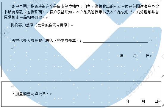 客户签名:                                    客户声明:投资决策完全是由客户独立、自主、谨慎做出的。客户已经阅读客户协议书所有条款(包括背面)、客户权益须知、本产品风险揭示书及本产品说明书,充分理解并自愿承担本产品相关风险。)