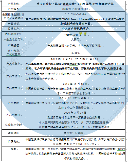 中国建设银行重庆市分行“乾元-鑫鑫向荣” 2019年第379期理财产品风险揭示书和产品说明书