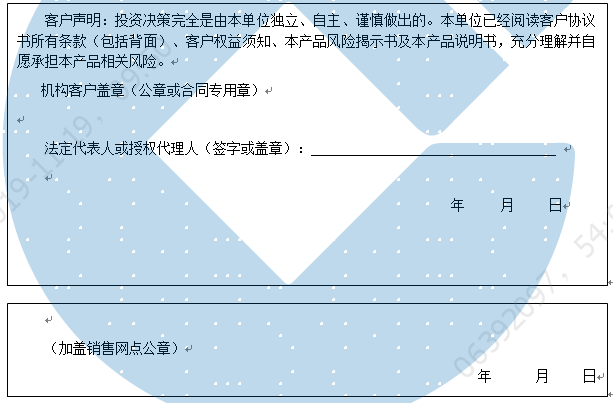 客户签名: ( 客户声明:投资决策完全是由客户独立、自主、谨慎做出的。客户已经阅读客户协议书所有条款(包括背面)、客户权益须知、本产品风险揭示书及本产品说明书,充分理解并自愿承担本产品相关风险。)