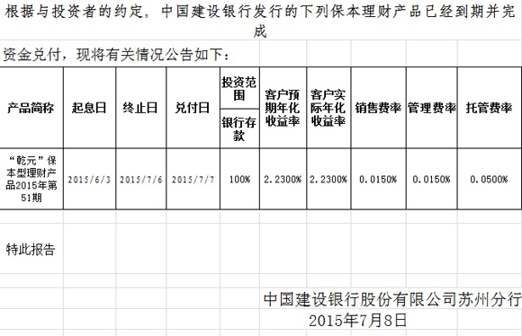 中国建设银行苏州分行保本理财产品2015年第6期理财产品兑付公告