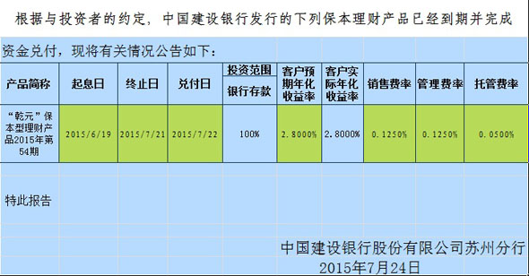 中国建设银行苏州分行保本理财产品2015年第54期理财产品兑付公告