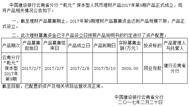 中国建设银行云南省分行“乾元”保本型人民币理财产品2017年第9期成立公告