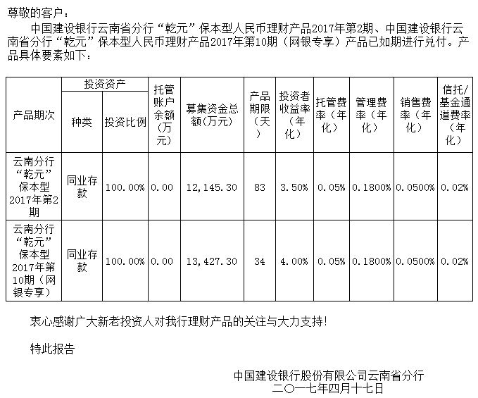 中国建设银行云南省分行“乾元”保本型人民币理财产品清算报告