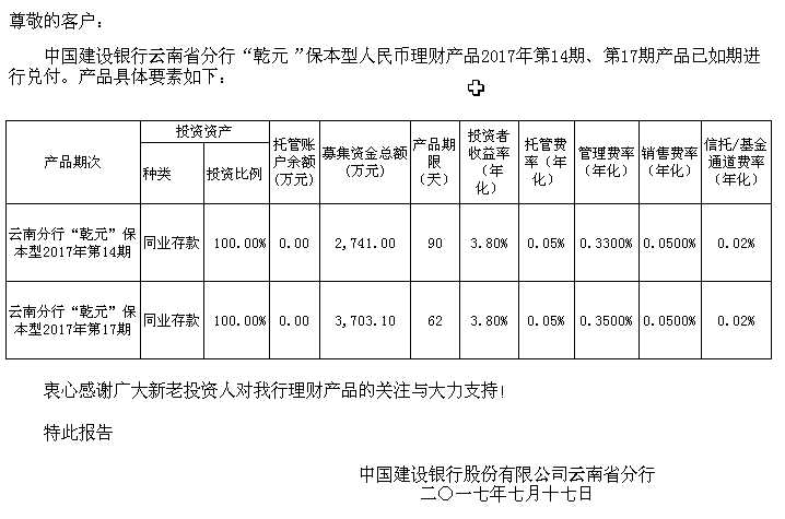 中国建设银行云南省分行“乾元”保本型人民币理财产品清算报告