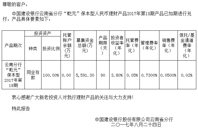 中国建设银行云南省分行“乾元”保本型人民币理财产品清算报告