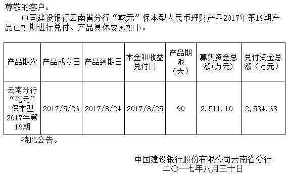 中国建设银行云南省分行“乾元”保本型人民币理财产品2017年19期兑付公告